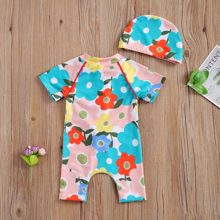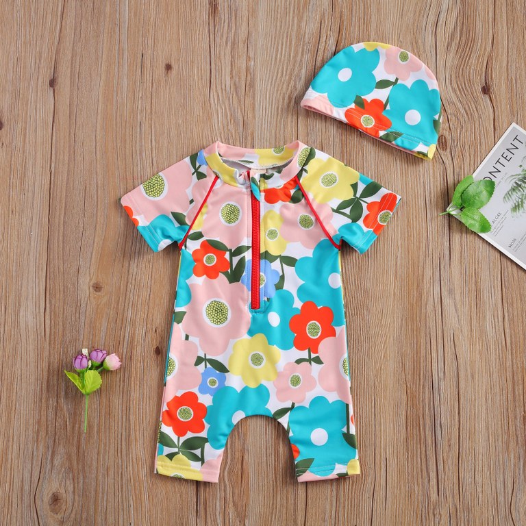 Baby Girl Swimsuit Swimwear Floral Print Short Sleeve Boys One Piece Swimming Suit Beach Bathing Suit Outfit